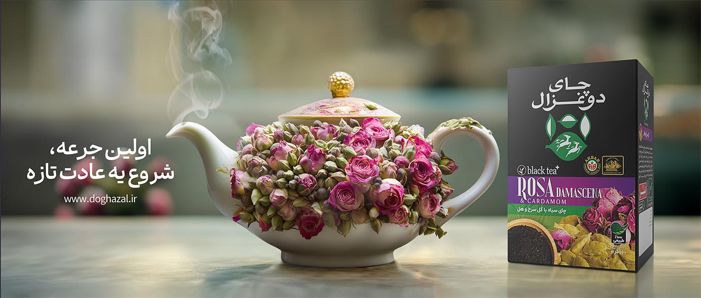 طراحی بیلبورد چای دو غزال در این طرح، تلاش کردم عطر طبیعی و طعم تازهی چای را با کنار هم قرار دادن یک قوری کلاسیک در کنار گلهای طبیعی و عناصر تازهی مرکبات، بهصورت بصری نشان دهم. حالوهوای گرم و صمیمی طرح، این پیام را تقویت میکند: